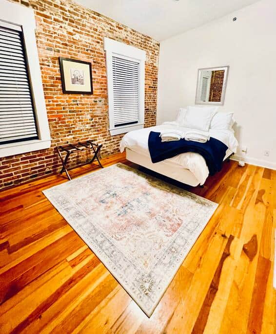 You will be in the heart of historic downtown Wilmington, NC! Steps from shops, restaurants, coffee shops, and the Riverwalk! See a show at the downtown waterfront amphitheater! Take in a sunset cruise, a carriage ride, or just stroll through the streets. Eating dinner may be on a balcony overlooking the infamous Cape Fear River or in one of the many locally owned, beautiful restaurants! Done with walking? Enjoy some time inside your spacious, cozy suite perfectly appointed just for you! Welcome to the amazing, beautiful, 100+-year-old Front Street Suites! You cannot be in a better downtown Wilmington location as you are on the corner of Market Street and Front Street! The apartment is on the second floor of a 100+-year-old building! Beautiful exposed brick and 500 square feet all to yourself! You have a fully stocked kitchen with everything you need from wine glasses to beautiful dinnerware to, most important, coffee and teas to wake you up for your day! There is a bar with seating for your snacks or meals. Snacks and water are provided for your arrival and comfort as a “welcome” and “thank you” for being our guest. The living room is designed to be cozy with lots of space to snuggle up and watch a movie on the big-screen television. The television is set up with streaming services so bring your logins and keep up with your favorite programs and movies while in your home away from home! The bathroom has plenty of space, a walk-in tiled shower, ample lighting, and plenty of counter space. Basic toiletries are provided as well as a hairdryer and cozy bath mats. The bedroom is super cozy and comfortable with a substantial comforter, extra blankets, and plenty of pillows. All linens are white, crisp, and clean except for the extra blankets giving the space some much-needed texture, color, and warmth. The bedroom has earplugs for each guest because the building is over 100 years old and is located right in the heart of the downtown activities. This is not the quietest location but it is the most convenient with the most to offer within walking distance. When you walk outside, be ready to be in the thick of the downtown activities, restaurants, and nightlife. Carriage rides are on the same corner as the building and there are numerous restaurants at the same intersection as the unit. Welcome to Wilmington! Have an amazing stay! We love to host! Let us know if there is anything we can do to improve your experience! We hope you love your experience and will return to stay with us many times! The door to the building is noted with the address. The door is black with large lettering with the address. The door has a combination lock that guests will receive prior to check-in. Guests will walk up one flight of stairs to a common landing/hallway. The unit door is at the top of the stairs off the landing/hallway. This is a common space. Once you enter the apartment, the entire apartment is private and for the use of only the guests on the registration. You will access the apartment from another keypad and your access code to your unit will be the last four digits of the primary guest’s phone number. The check-in is contactless. Messages will be answered asap. Any additional interactions are at the guests’ request. The neighborhood is in historic downtown Wilmington, NC! This is the place to be for all entertainment and activities! Step outside to wonderful restaurants, coffee shops, and nightlife. Walk around and experience carriage rides through historic neighborhoods, boat rides on the infamous Cape Fear, ghost tours, music venues, and the unbeatable Riverwalk! This is where people go to enjoy everything a historic downtown has to offer and has been offering for hundreds of years! There is street parking that can be paid for, extended, and updated via the PayByPhone app. Street parking is paid daily from 9:00 am to 6:30 pm in varied intervals from .5 to 2-hour increments. There is also a parking deck about 100 feet away where you can park and leave for the term of your stay. The parking deck is recommended and enjoying amenities within walking distance is ideal! The parking deck location is: 115 Market Street Wilmington, NC 28401